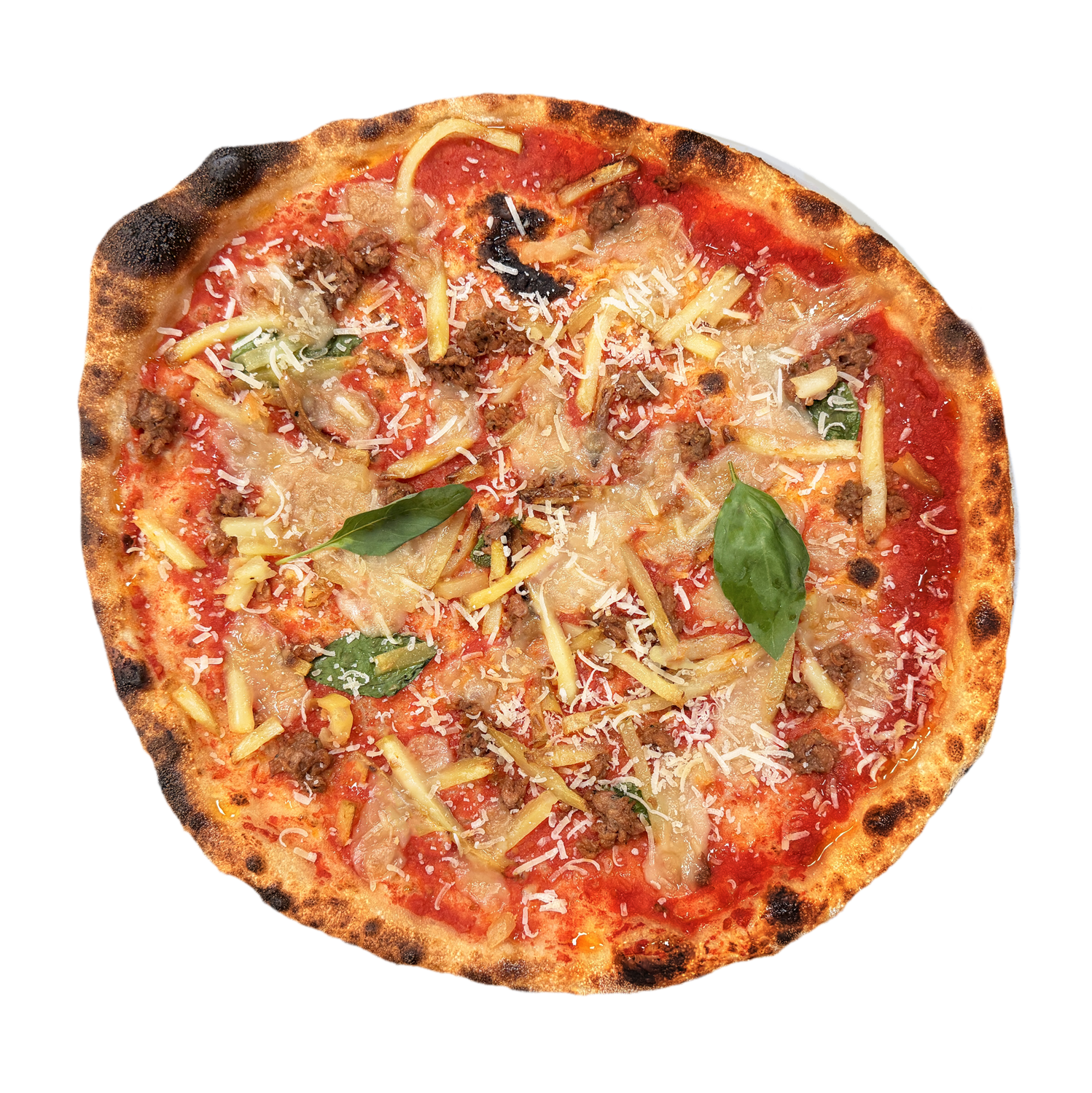 Pomodoro, Basilico, Patate al Forno, Beyond Meatballs, Filarella Fume, Grattosino Vegano e Pepe Nero.